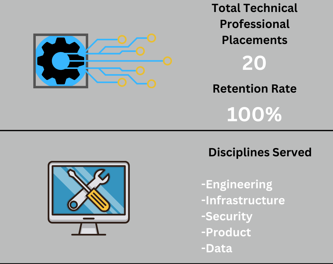 This year, we proudly placed 20 technical professionals into critical roles across the industry, each position commanding annual salaries over $80k. With a 100% retention rate, these placements underscore the quality of talent we deliver and the trust we’ve built with both candidates and clients.
